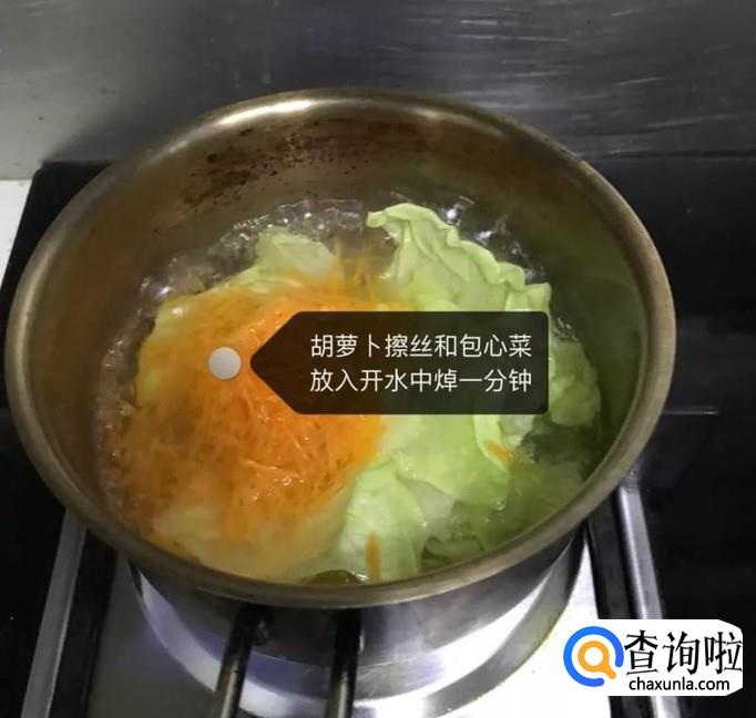 然后锅中放入适量的的清水,待水烧开,将胡萝卜擦成丝和包菜一起倒入锅中焯一分钟,捞出控干,如图所示。