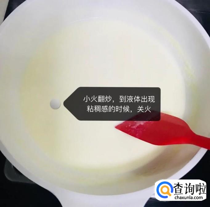 接着开小火不停的翻炒,等到锅中的液体出现粘稠感的时候,关火,如下图所示。