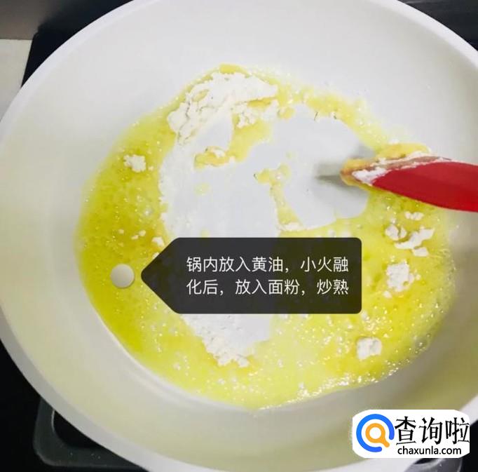 然后在锅内放入黄油,小火熬至融化,放入面粉炒熟,如下图所示。