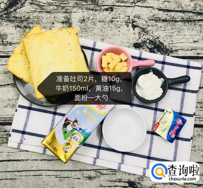 首先准备好所有的食材,如下图所示。小贴士:吐司两片,糖10克,牛奶150ml,黄油15克,面粉一大勺。