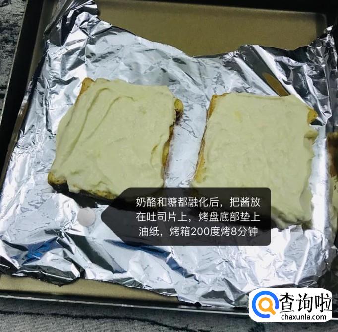 等到糖和奶酪完全融化以后,把酱涂抹在土司片上,如下图所示。