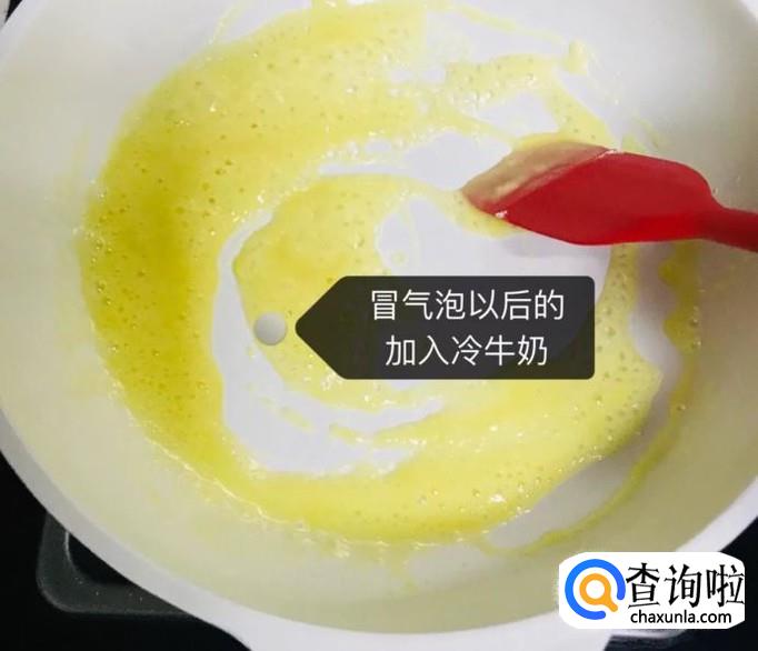 等到锅中冒气泡,加入冷牛奶,如下图所示。
