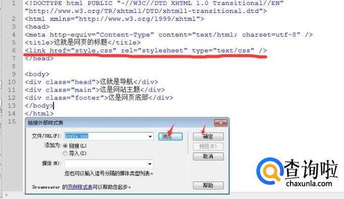 然后会弹出一个连接外部样式表,点击浏览,找到刚才保存的style.css文件,双击返回对方框后点击确定,就会下代码去里面自动生成一段引入外部样式代码,即link。如下图: