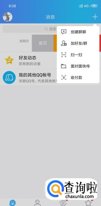 进入qq主界面,右上角有一个加号,点一下。