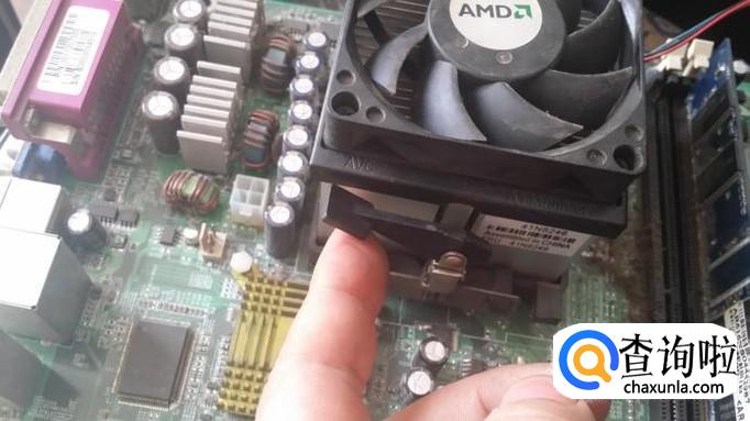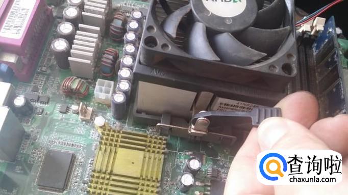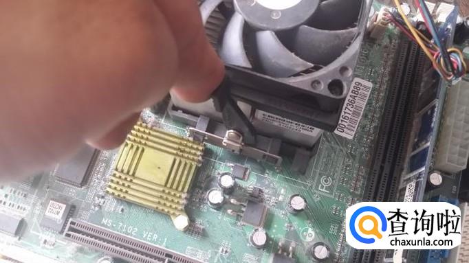 这个散热器是通过扣具扣在底座上的,其中一侧有个扳手。把扳手先向上再向另一个方向压过去,就松开了扣具。