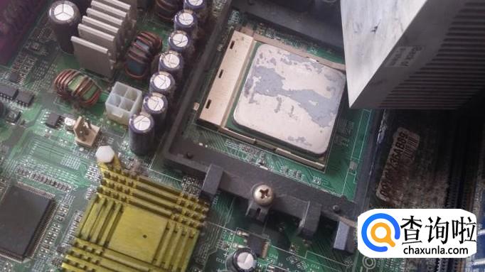 然后把有扳手一侧的扣具退出,就可以把整个散热器取出。这时露出底下的CPU,可以看到上面的导热硅脂已经干了。