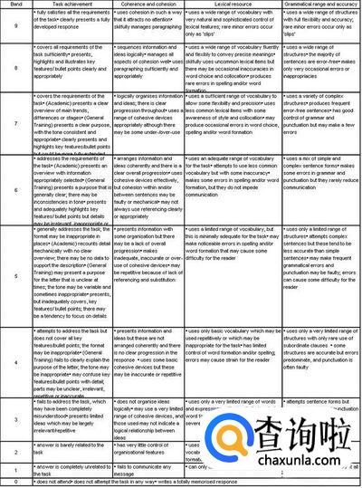 评分系统:采用九分制,每一分制代表一种评价。9分代表接近母语为英语人士水平优秀,具有完全的英语运用能力,做到适当、精确、流利并能完全理解语言。8分代表非常流利,基本没有错误,能将英语运用自如,只是有零星的错误或用词不当。在不熟悉语境下可能出现误解,可将复杂细节的争论掌握的相当好。7分代表良好水平,流利,准确,偶有错误。6分为合格水平,能够较流利使用英语,大致能有效运用英语,虽然有不准确、不适当和误解发生但能使用并理解比较复杂的英语,特别是在熟悉的语境下。5分为基础水平,基本掌握英语,能进行日常交流,可部分运用英语,在大多数情况下可明白大致的意思。虽然经常出现错误,但在经常涉及的领域内可应付基本的沟通。4分为有限水平,有较多错误,但能表达基本意思,只限在熟悉的状况下有基本的理解力,在理解与表达上常发生问题,无法使用复杂英语。3分为极有限水平,可进行简单沟通,在极熟悉的情况下也只能进行一般的沟通,频繁发生沟通障碍。2分为初学水平,掌握简单词组,除非在熟悉的语境下,几乎只能使用孤立单词或短句表达最基本的信息,不能达成有效沟通。难以听懂或者看懂英语。1分为不懂英语,掌握个别单词,几乎无法交流,最多能说出个别单词,根本无法用英语沟通。