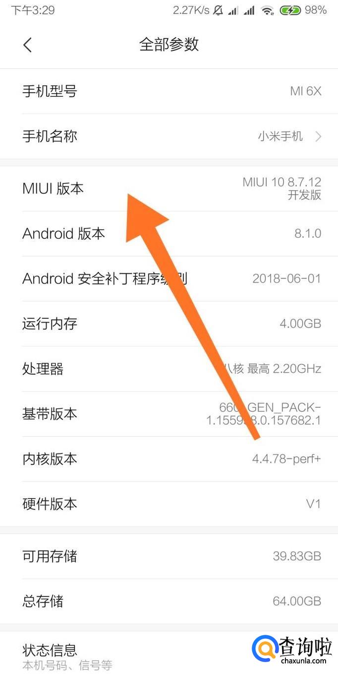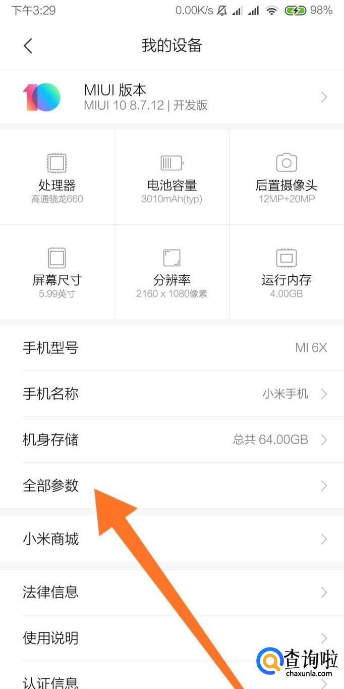 进入“全部参数”页面后,接下来连续点击“MIUI版本号”七次即可。