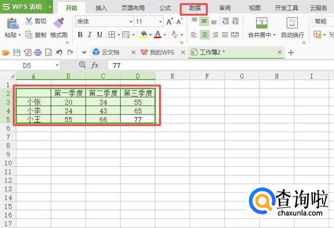 然后我们选中数据的区域,之后点击工具栏中的数据;