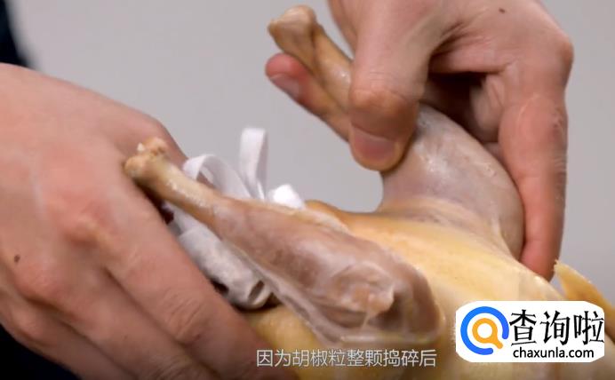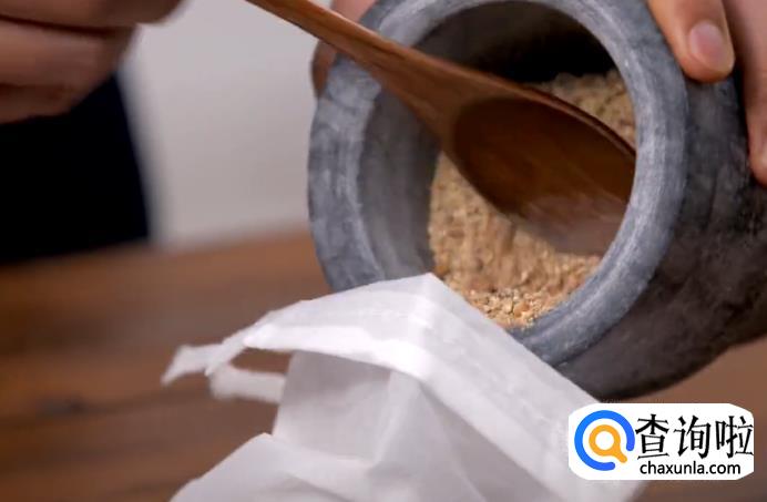 将白胡椒粒捣碎,装进纱布袋中,将纱布袋密封好,然后塞进鸡腹中。不建议用现成的白胡椒粉,因为胡椒粒整颗捣碎之后,煲出来的汤会更加香浓。