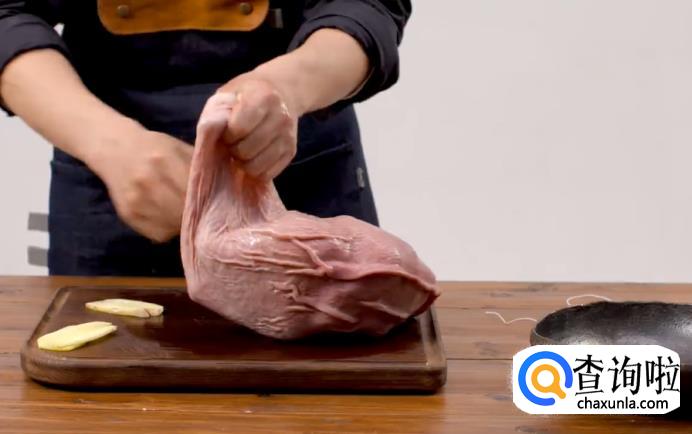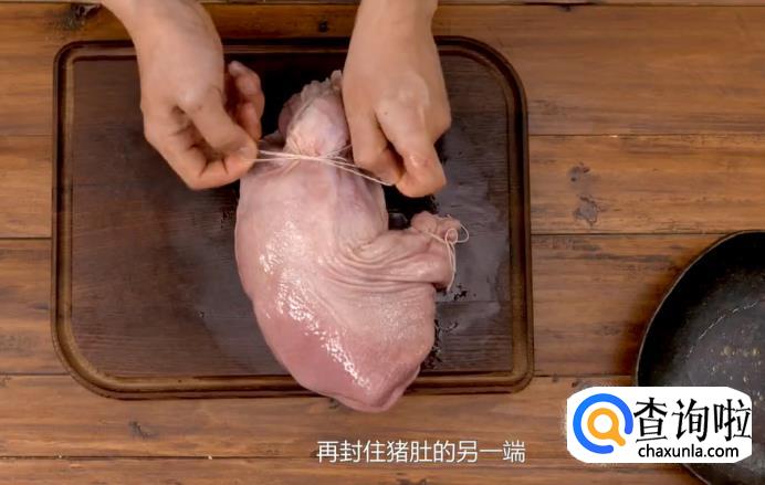 现在来处理猪肚。猪肚要预先洗干净,用线将靠近肚尖部分的一端扎紧。