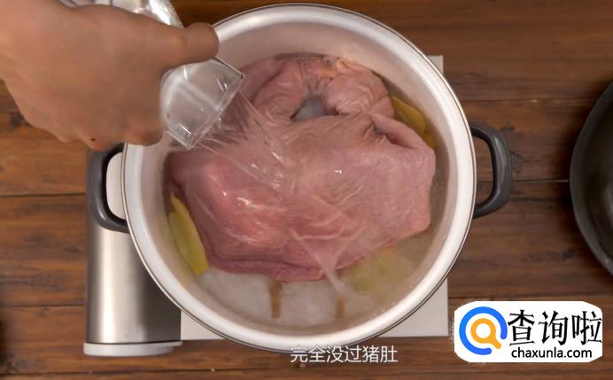 接着,在锅里加姜片,注入清水,水量需要完全没过猪肚。然后开火将水烧沸后,再煮上2、3分钟,撇去浮沫,盖上锅盖,转中小火慢炖2个小时。