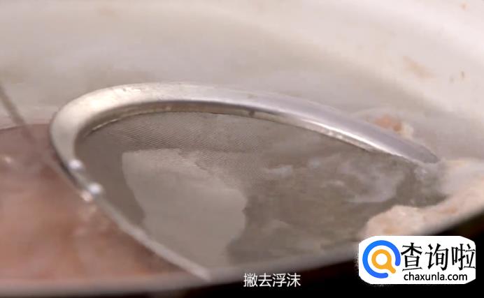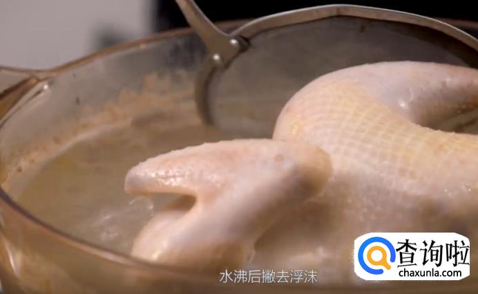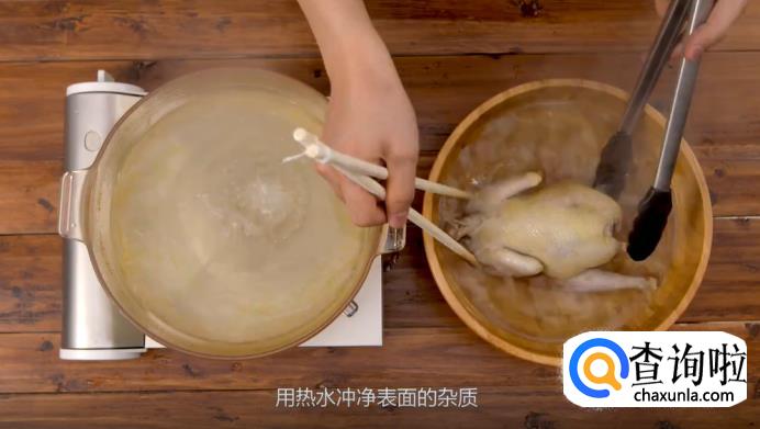 煮沸之后,将浮沫撇去,再把鸡身捞出来放入热水中,冲干净表面的杂质。