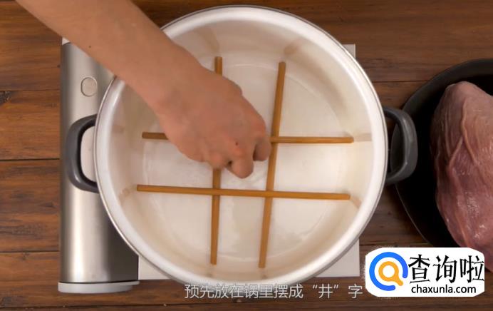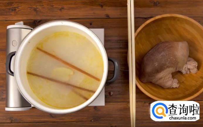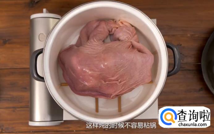 猪肚入锅炖之前,取两双干净的筷子,预先在锅里摆成“井”字,摆好之后再放入猪肚,这样炖的时候不容易粘锅。