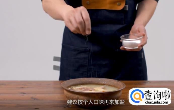 3、在炖汤的时候最好不要放盐,因为加了盐之后会影响鲜味的析出。等成汤之后再根据个人的口味撒一点点盐就可以了。