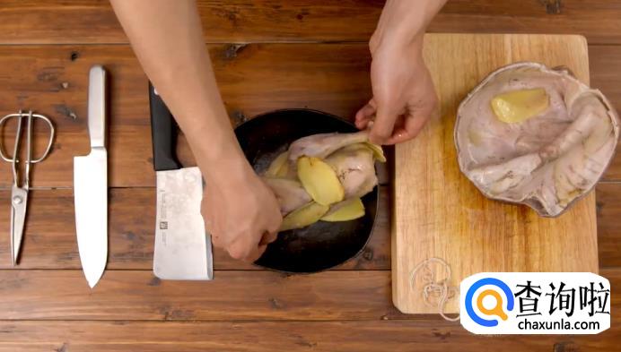 然后,将整只鸡塞入猪肚,同时放入姜片,再封住猪肚的另一端。