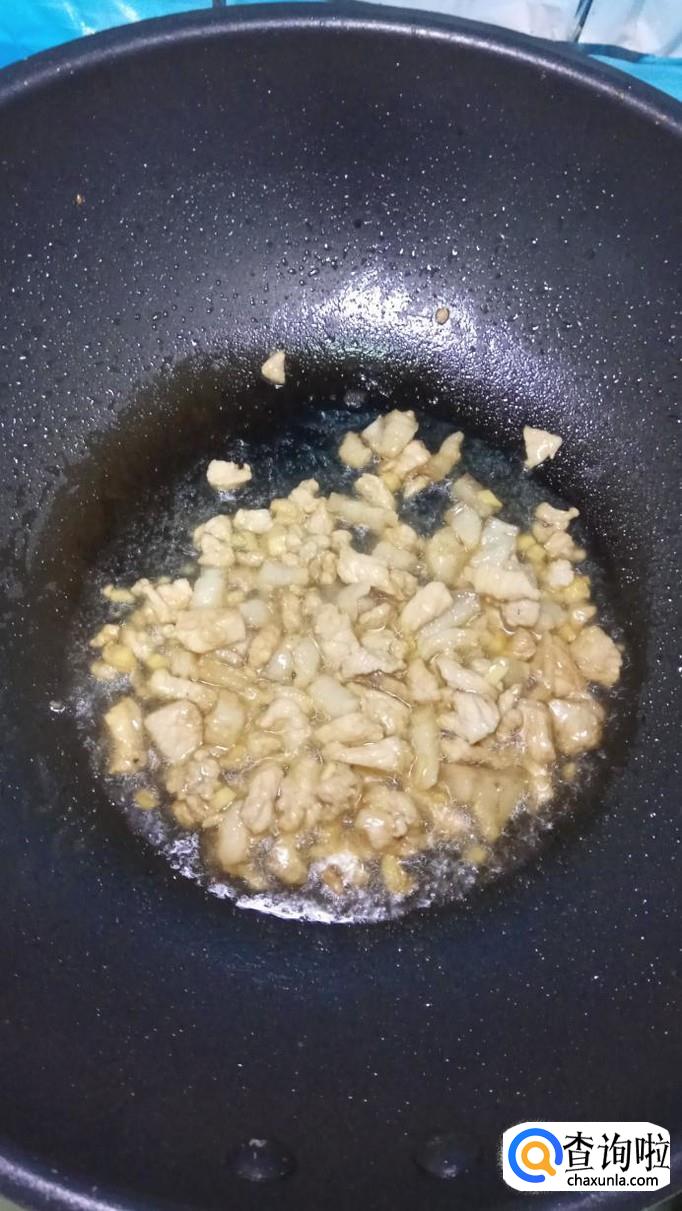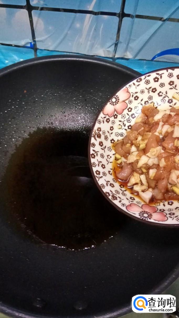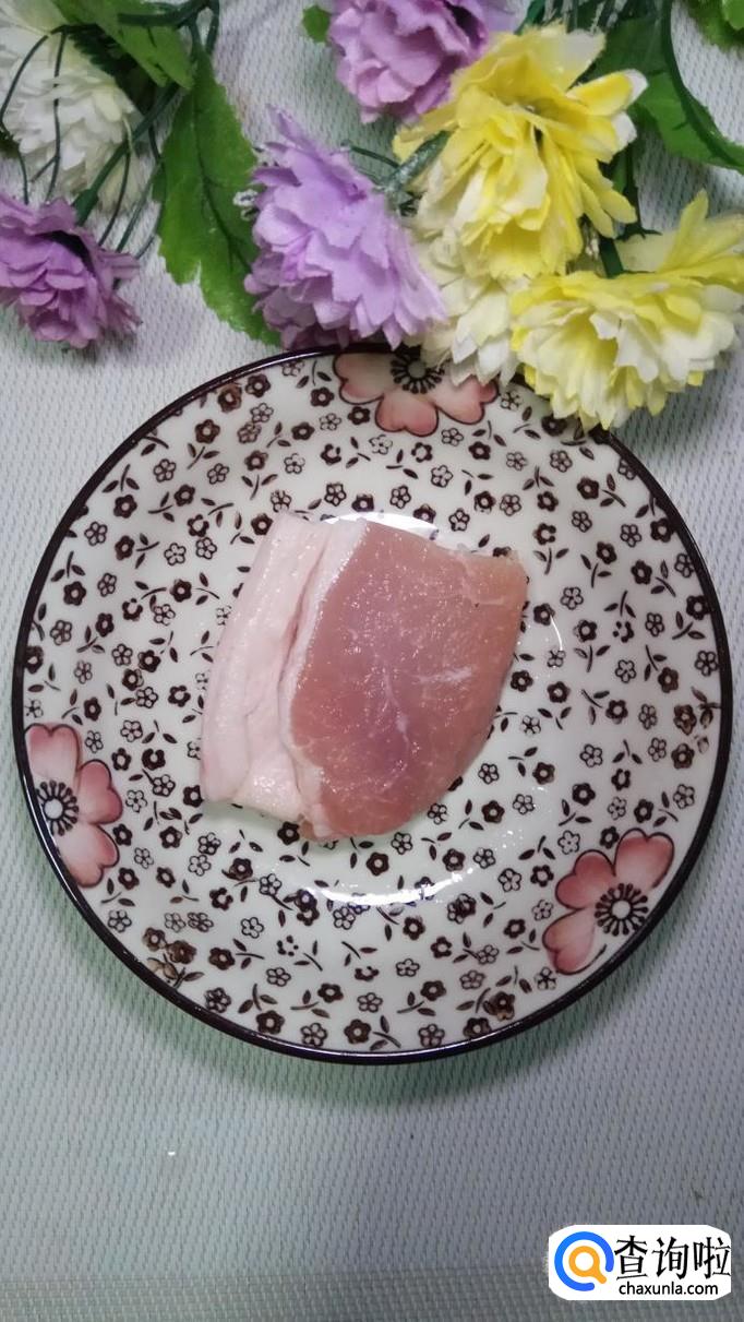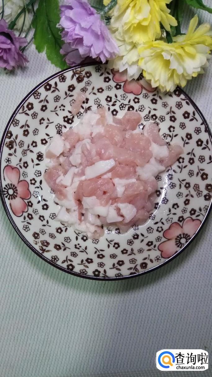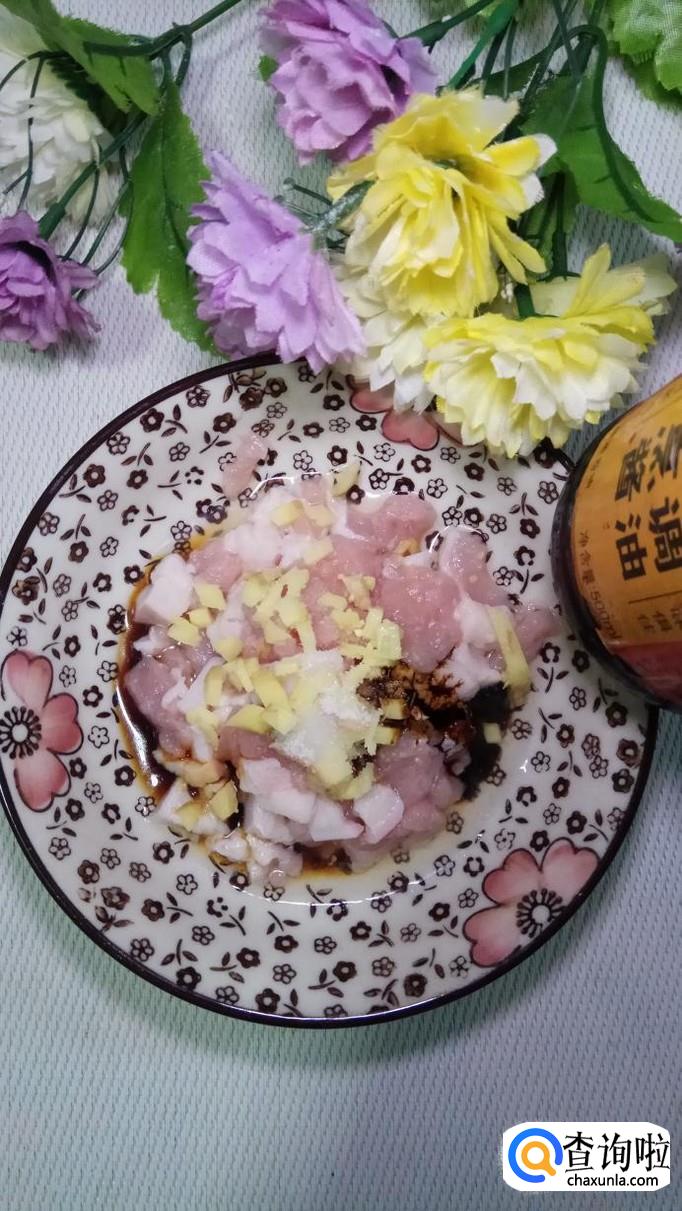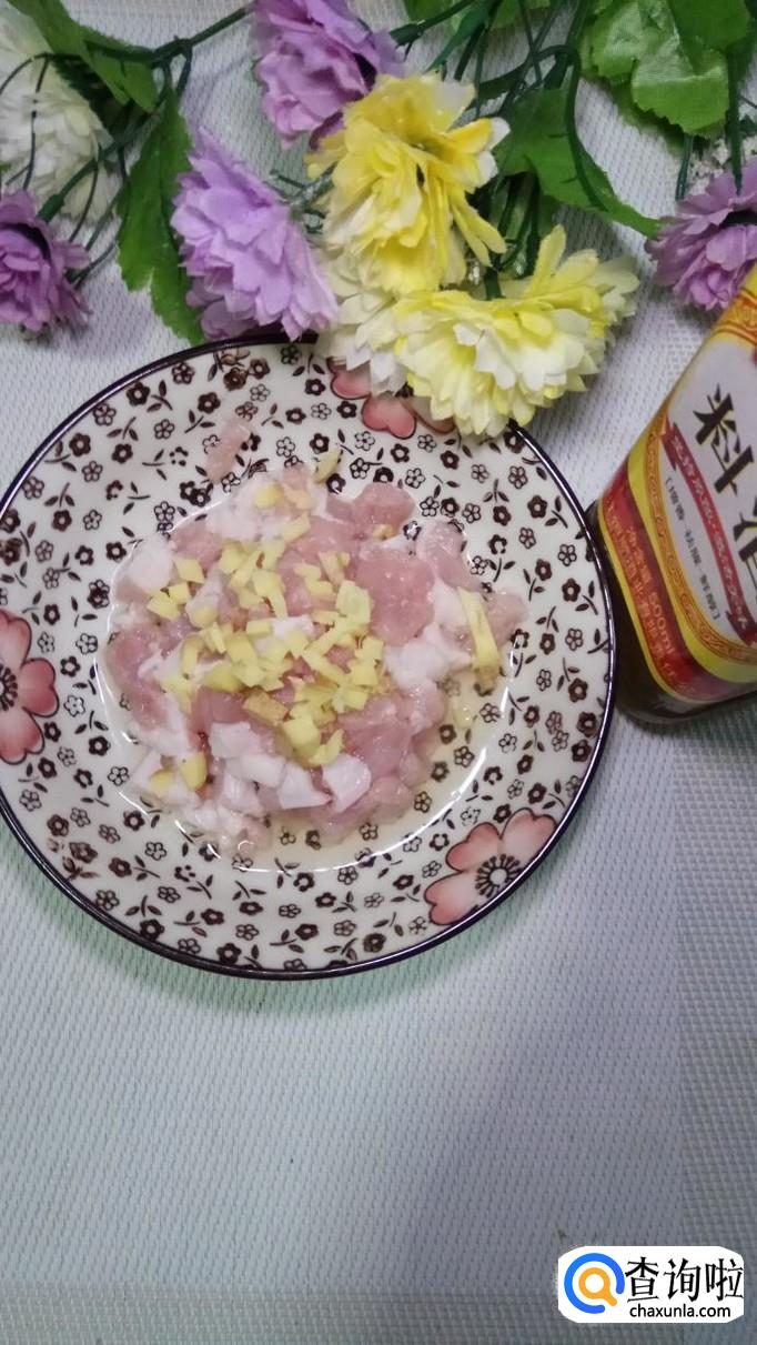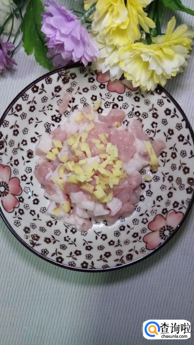 准备一块新鲜的五花肉,洗净后切成小块,再准备适量姜,切成末,放在上面。姜末可以很好的去除肉的腥味。