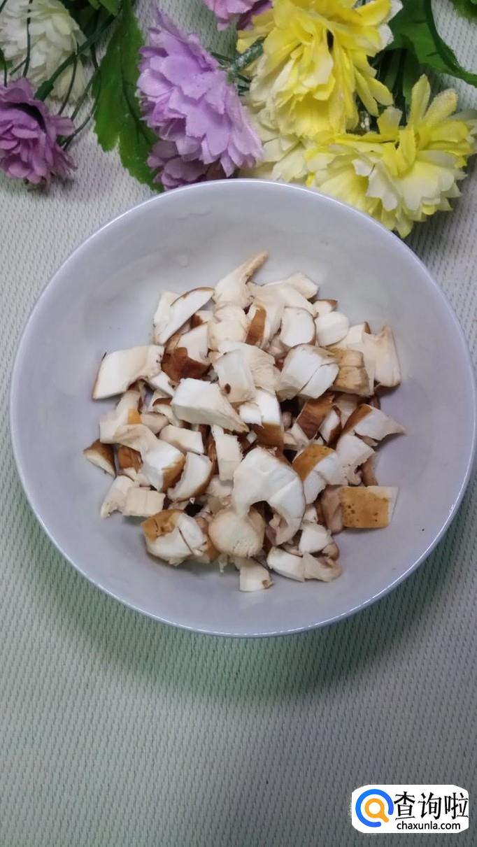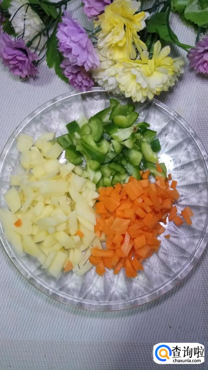 将土豆洗净后切成小块,洗去淀粉,放入盘中备用,再将青椒和胡萝卜也切成小块儿,放在一起,将洗好的香菇,也切成块备用。