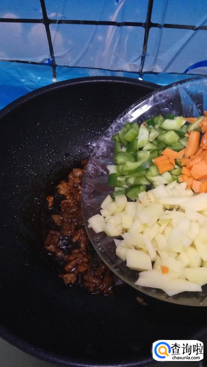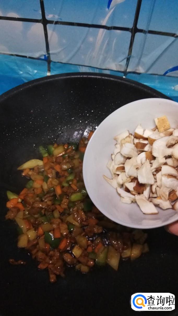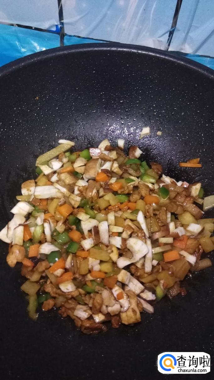等到甜面酱炸出香味,再放入准备好的青椒块,胡萝卜块,土豆块,翻炒两分钟左右,再倒入准备好的香菇块儿一起翻炒。