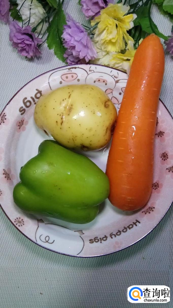 准备适量土豆,青椒,胡萝卜洗净,再准备适量香菇,洗净备用。