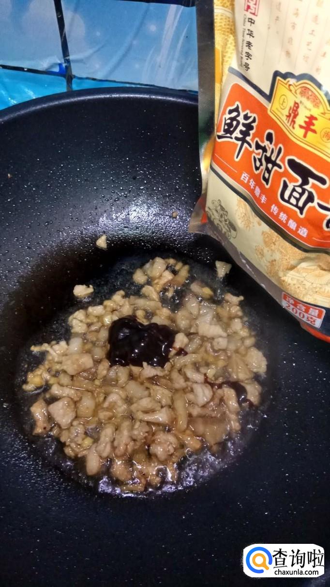炒锅中放入适量油,热后,将五花肉放入锅中,炒一下,炒至五花肉变色后,放入适量甜面酱。