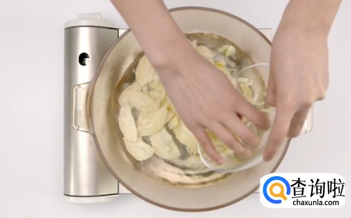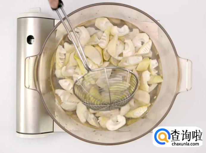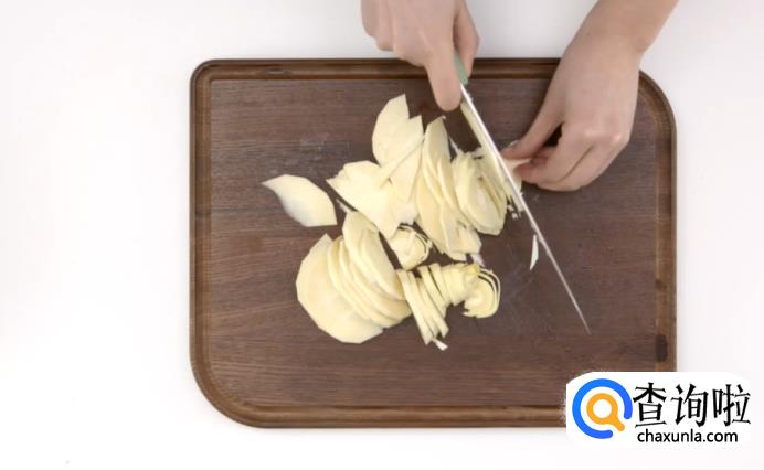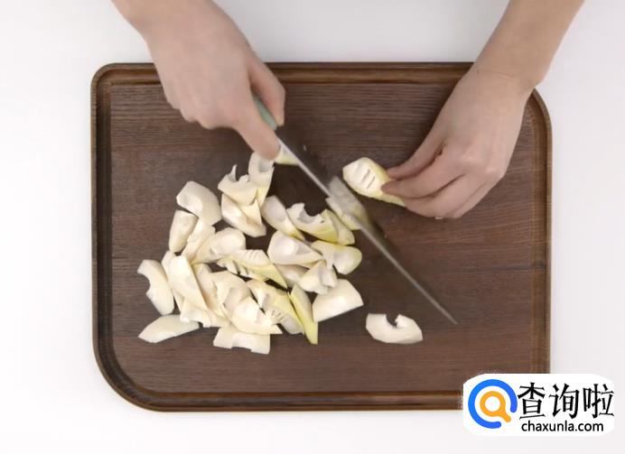 接着,将冬笋切成薄片,放入冷水中开火煮。