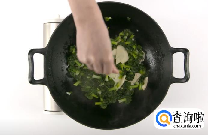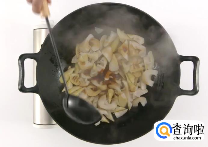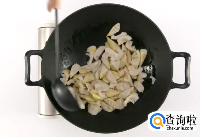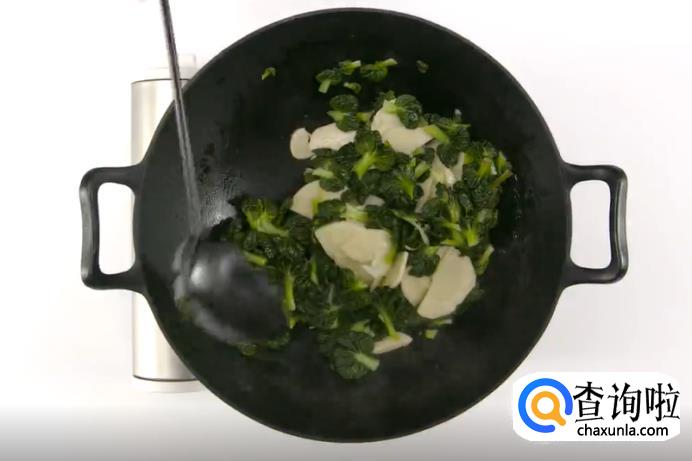 然后,再把笋片倒进去,和塔菜一起炒匀。