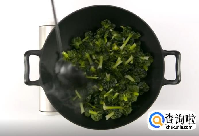 接着,将锅烧热,放入猪油,等猪油融化之后,将切好的塔菜倒入,开始翻炒。