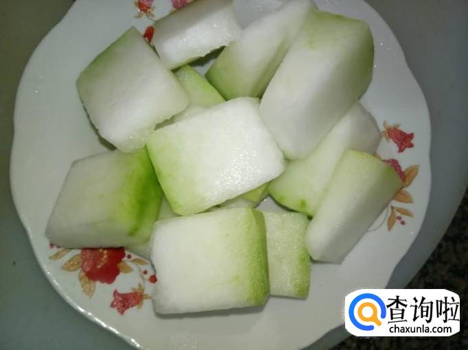 将冬瓜去皮去囊,洗净,再切成块状;不能切太小了,不然煮的过程中会烂成泥了;