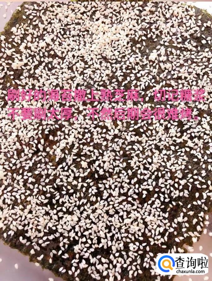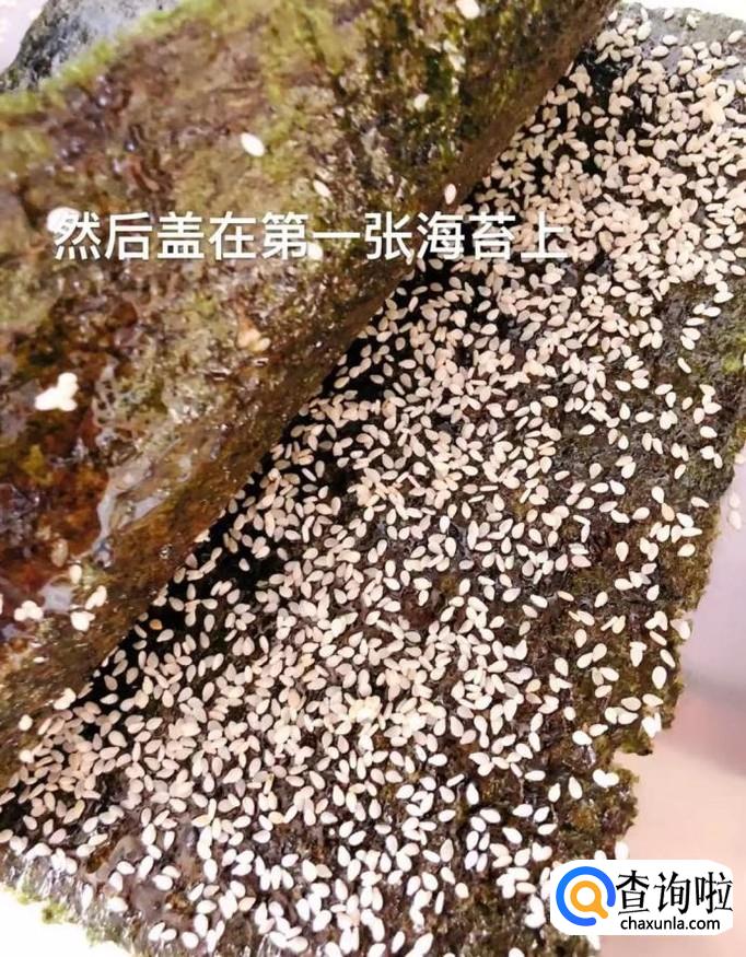 然后在海苔的表面上撒上一层芝麻,如下图所示。小贴士:喜欢吃芝麻的朋友们可以多撒一些,做到均匀就可以了。