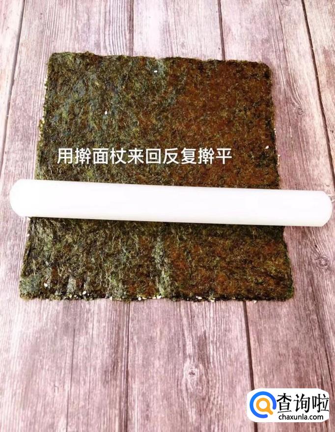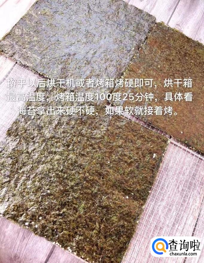 接着把擀好的海苔放到烤箱100°火烤25分钟就可以了。小贴士:大家可以试着掰一下海苔,如果比较硬,那么说明我们的海苔烤好了;如果比较软,那么请继续烤五分钟左右就差不多了。