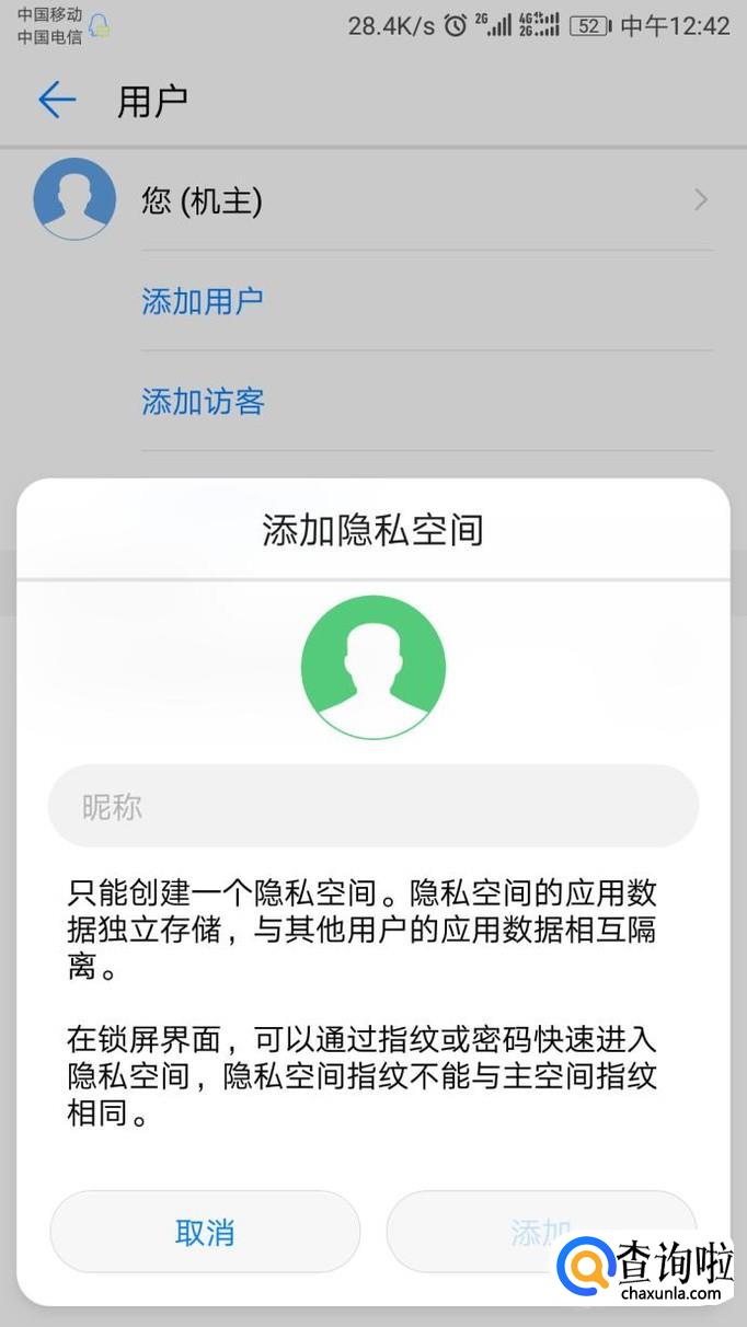 然后点击添加隐私空间,根据提示操作填写一个昵称