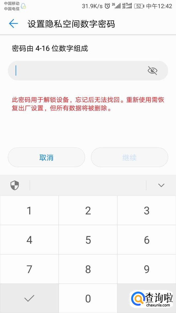 然后设置隐私空间的数字密码,再确认一遍密码,然后等待几秒创建隐私空间