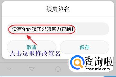 设置锁屏签名相对就简单很多了,我们依旧返回到刚才的页面,这次点击“锁屏签名”,然后页面的最下方会弹出一个输入窗口,我们把自己想要修改的前面输入进入点击“保存”即可;