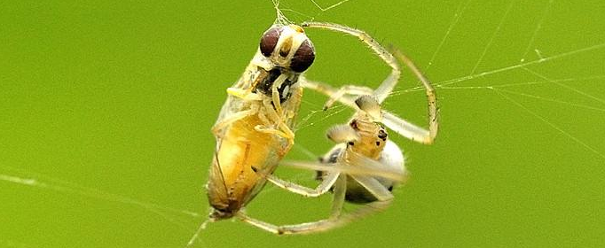一只花园蜘蛛静静地呆在网的一角,一只蛾子飞舞着撞了上去,花园蜘蛛“闻”讯后冲出来,一口咬在还在挣扎的蛾子身上。蛾子慢慢地不再挣扎后,花园蜘蛛才抽出丝来,像捆绑贼一样将蛾子死死捆住。一只蚱蜢投到了网上,花园蜘蛛也快速冲了出来,不过,它所做的第一件事不是撕咬对方,而是抽出丝来,将正在挣扎的蚱蜢的大腿紧紧缠起来,直到蚱蜢不能动弹时,它才一口咬在蚱蜢身上。