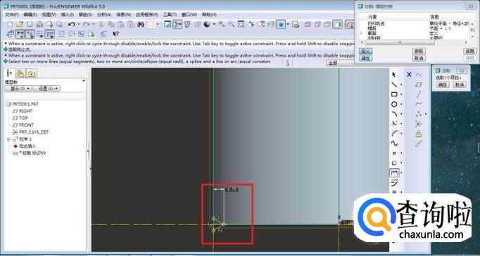 因为是用螺旋扫描来造螺纹,所以还缺少扫描的截面没有设置,如下图所示,画好截面的三角形,约束好尺寸,这里的尺寸一定不能乱来,得根据前面的节距值1.5来计算。