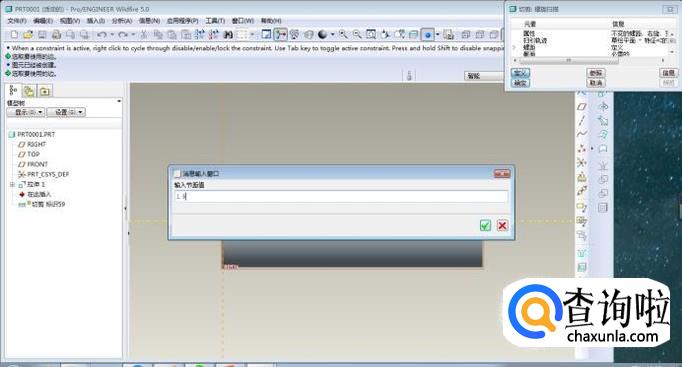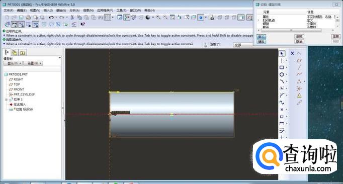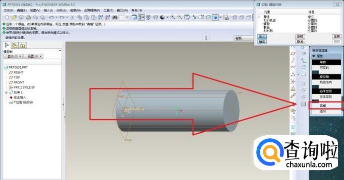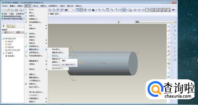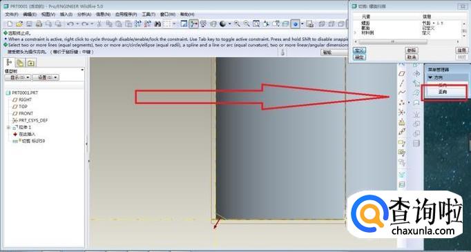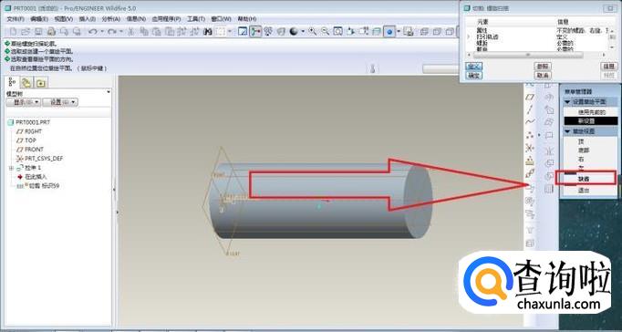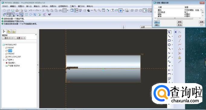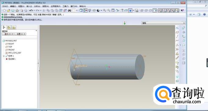 按照“菜单管理器”的操作提示,先设置草绘平面,这里选择除圆柱两个平面之外的任何一个平面都可以,我选择的是Top面,选择完平面之后,还需要设置方向,一般选择正向,之后就在新弹出的选项中选择缺省就可以进入到草绘状态了。如下两幅图所示,点击完“缺省”,立马进入到草图工作状态。