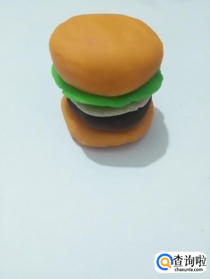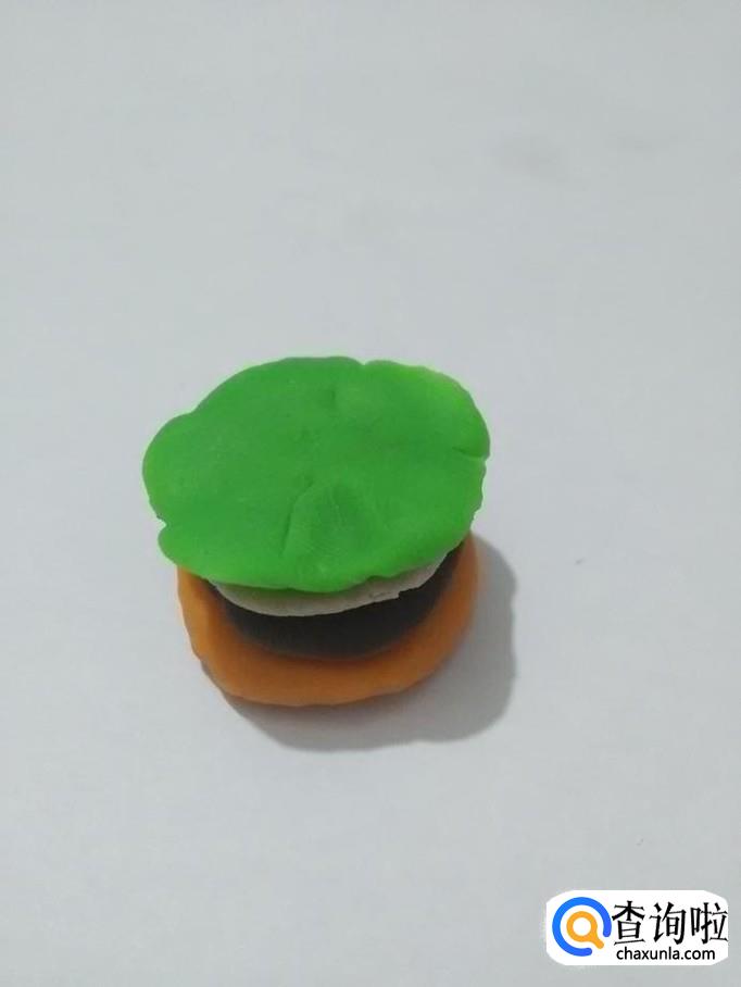 用一大块桔色捏成顶部圆形的圆片,粘在生菜上面,当作最上层的面包。