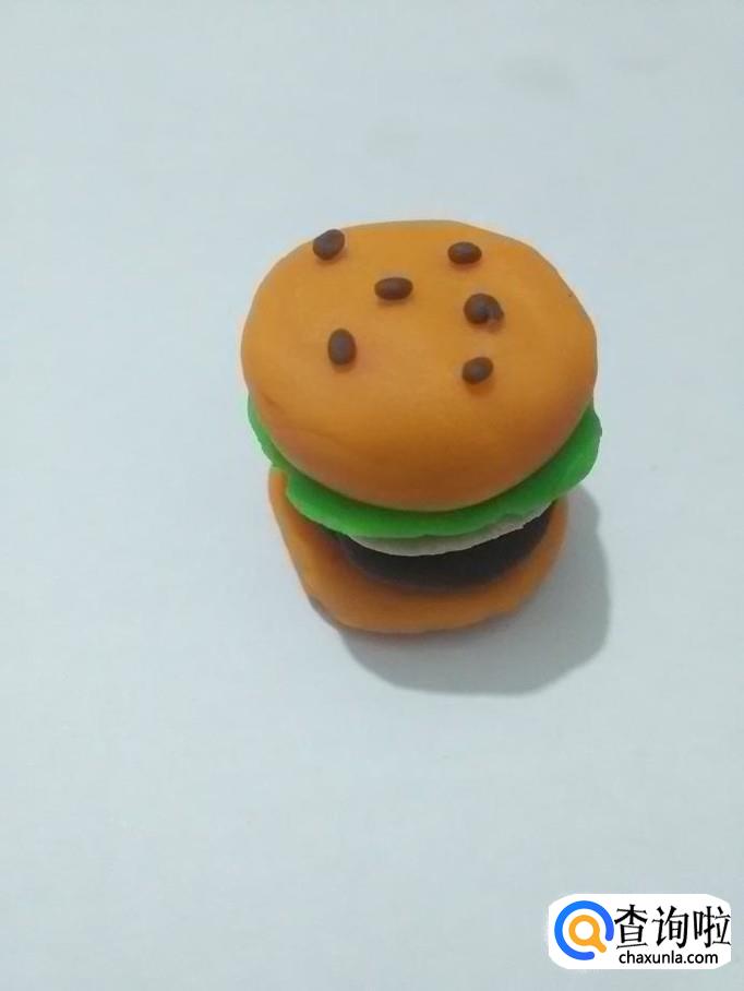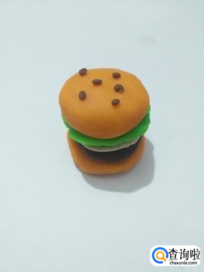 用棕色团几个小球,粘在最上层面包上面,当作芝麻,粘土食物就做完了。