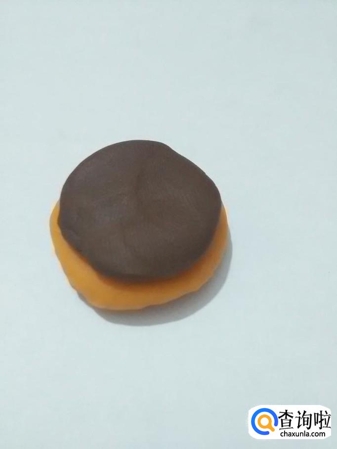 用棕色也团一个圆球,再按成扁片,粘在下层面包上面,当作牛肉饼层。
