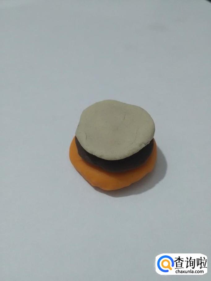 用白色再捏一个圆片,粘在牛肉饼上,当作芝士酱层。