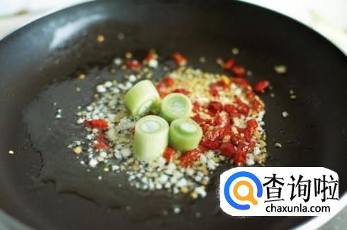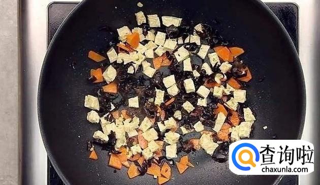 油热后,倒入姜末、辣椒及土豆丁、豆腐丁、胡萝卜丁,木耳丝。