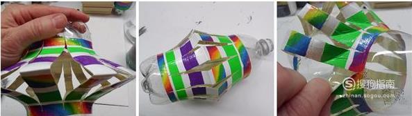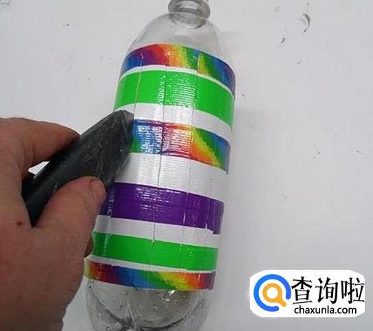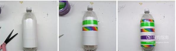 剪下不同颜色的胶带成条状,粘贴在瓶子的中间部分,如下图所示,有一个条纹效果。