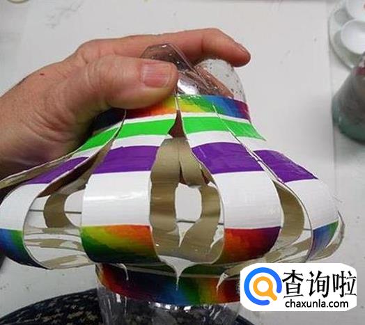 用力按压瓶子的顶部和底部,让切好的竖条凸出。