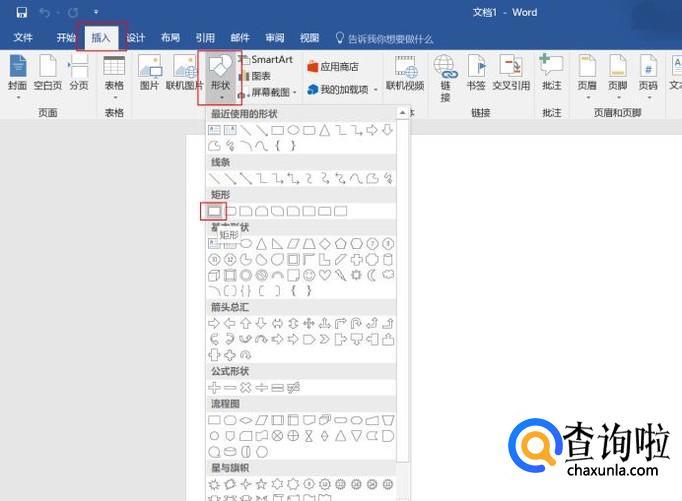 打开Word文档,依次点击“插入”--“图形”,然后选择矩形。