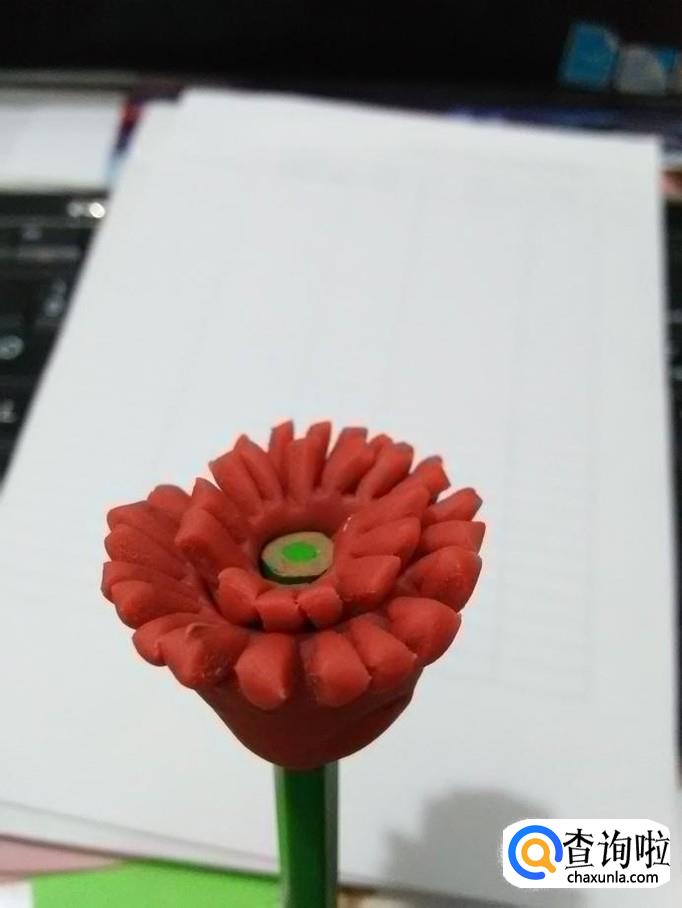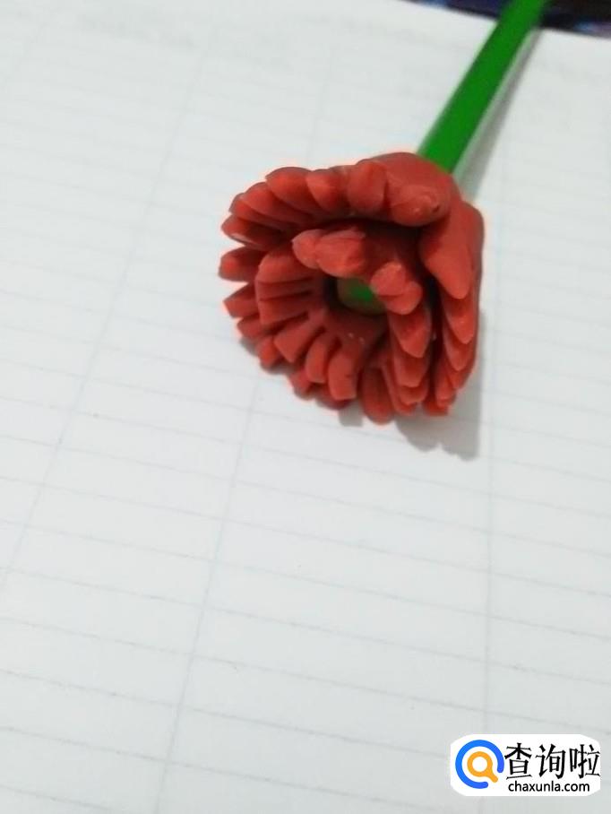 将绿色彩笔放在彩泥的一端,向上开始卷起,一直将整片彩泥全部卷完,康乃馨花朵就做好了。