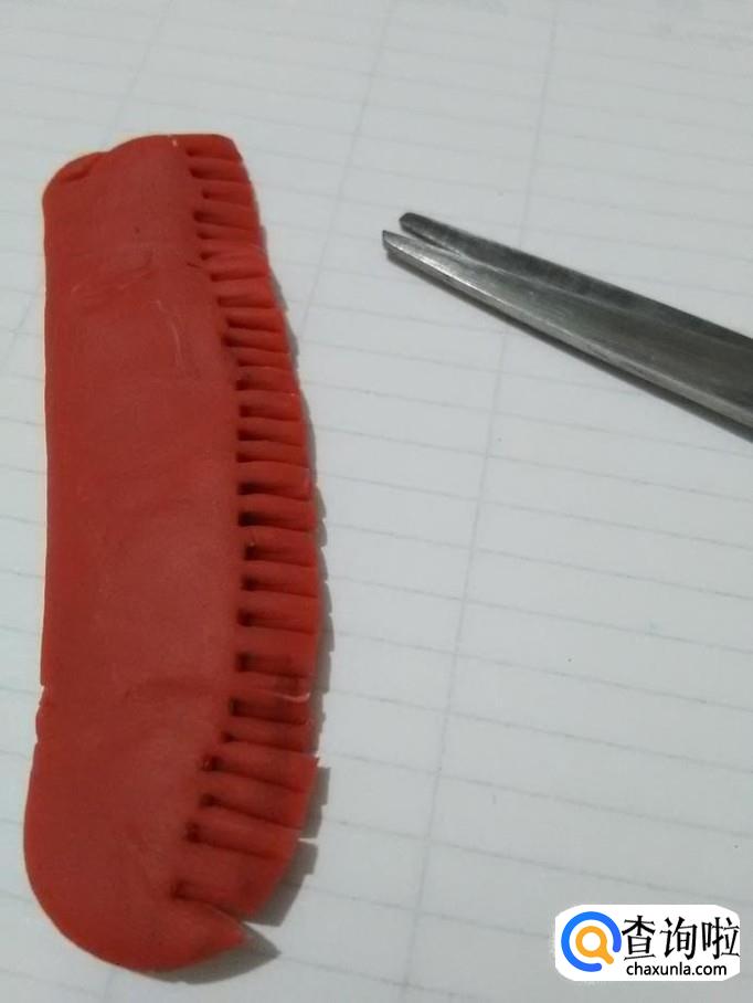 用剪刀在彩泥右边剪出许多细细的小条,表示花瓣边缘的花边儿。
