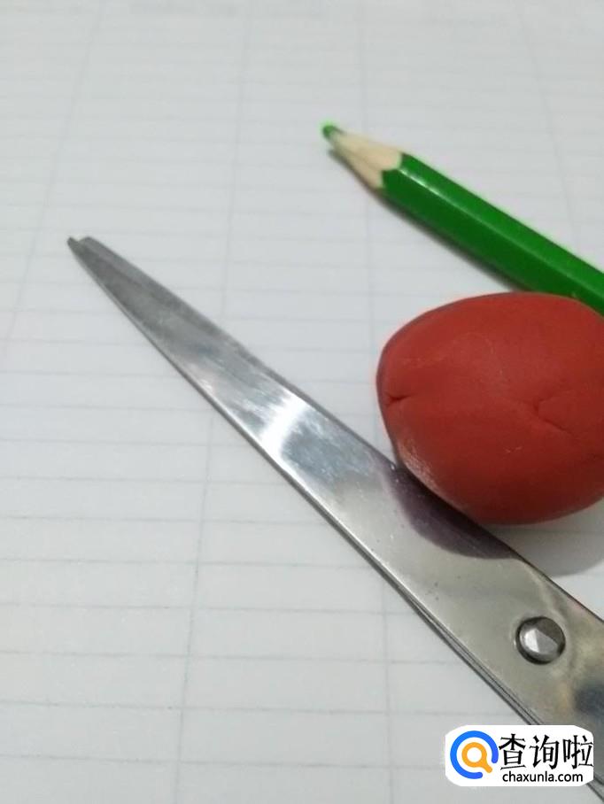准备一团红色的彩泥、一把剪刀、一支绿色的彩笔。