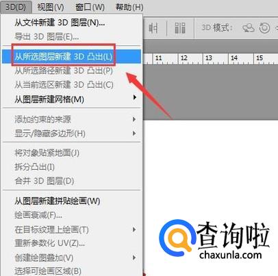 点击3D选项在其下拉菜单那里找到从所选图层创建3D凸出选项,如图所示: