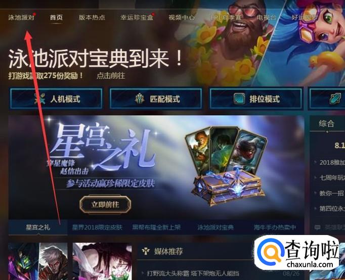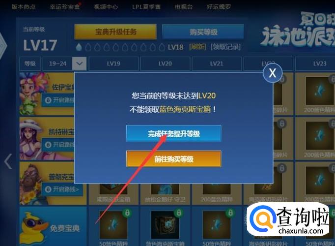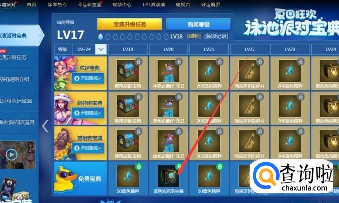 然后找到泳池派对,然后点开页面,之后你会看到有升级的任务,当前我是18级,下面找到传送门,如下图,